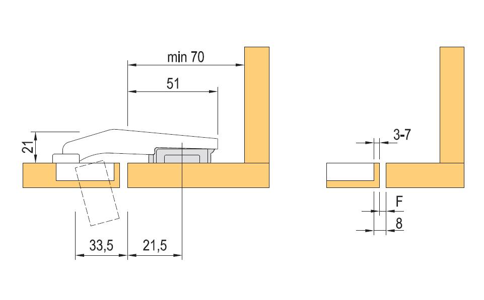 Závěs pro konstrukce se slepým úhlem. Úhel otevření 95°. Verze k našroubování. Tlumič dorazu BLUMOTION k zavrtání na straně závěsu 970A1002 - 12398. Základní podložky o 3 mm zvýšené. Nutno použít pro srovnání slepých dvířek a čela !: vrut 173L6130 - 12304, euro 173L8130 - 12305, štelování excentrem 173H7130 - 12341, expando 174E6130.01 - 12303. Ostatní podložky viz.katalog BLUM.Doplňkové parametry