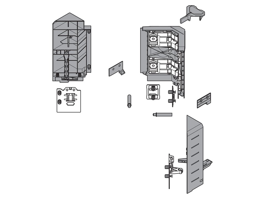Sada čelního kování pro novou verzi rohové zásuvky SPACE CORNER se SYNCROMOTION s odklopnými čílky. Pro výšku zásuvky "D". Nutno doplnit držáky zad (13894).Doplňkové parametry