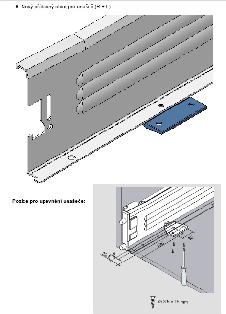 Externí tlumič pro systém METABOX. Pro šířku korpusu do 900mm stačí použít pouze jeden kus. Pro správnou funkci je nutné upevnit dvěma vruty + novým otvorem v bočnici.