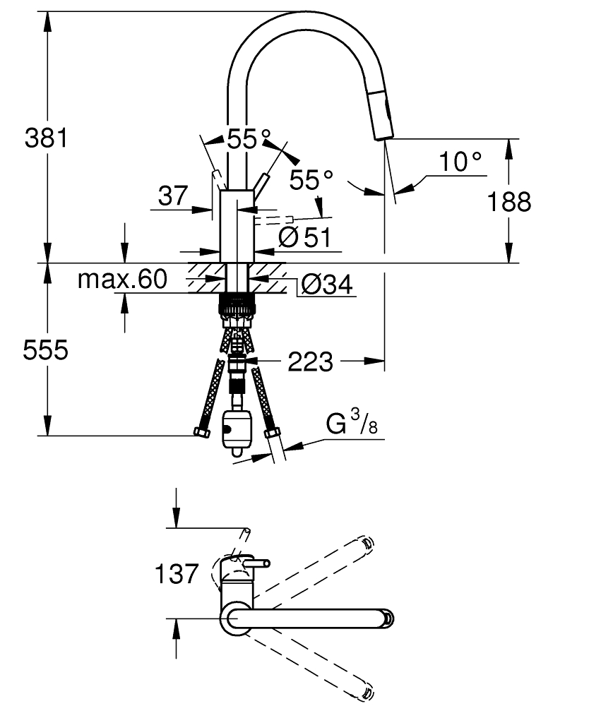 vysoká výpusť jednootvorová montáž GROHE StarLight chromový povrch keramická kartuše s technologií GROHE SilkMove 35 mm GROHE EasyDock GROHE Zero vedení vody uvnitř - bez niklu a olova vytahovací sprška Dualní přepínání: perlátor/SpeedClean sprchový proud variabilně nastavitelný omezovač průtoku otočná výpusť úhel otočení 360° zajištěno proti zpětnému toku flexi připojovací hadičky GROHE QuickFix rychlomontážní systém