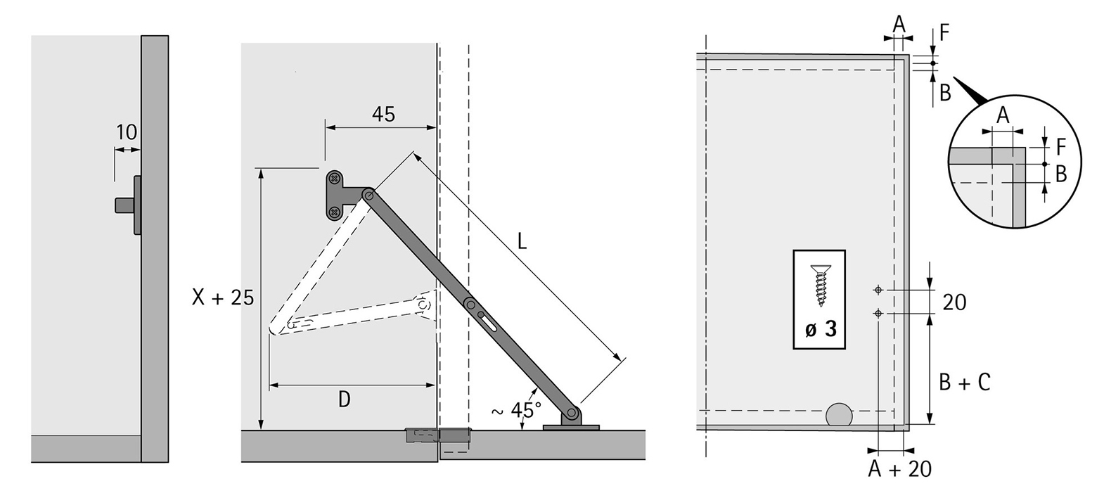 Sklopné kování 250mm pro dřevěná dvířka nebo dvířka s dřevěným rámem. Použitelné jednostranně nebo oboustranně (vlevo a/nebo vpravo). Světlá výška korpusu min. 202mm. Ocel niklovaná.