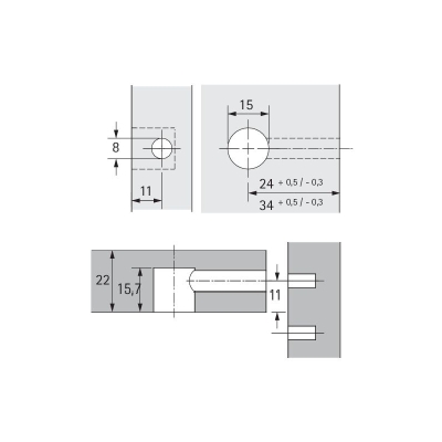 Excentrické spojovací kování Rastex 15. Pro tloušťku dílce 22 mm. Bez osazení, bez povrchové úpravy. Zinkový odlitek.Doplňkové parametry