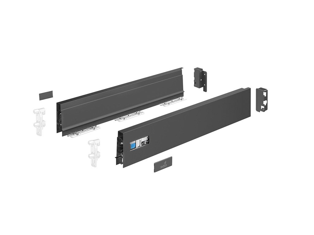 Sada obsahuje komponenty pro sestavení zásuvky Innotech Atira: 2 ks bočního profilu zásuvky (levý a pravý), 2 ks čelních příchytů s rozpěrným pouzdrem, 2 ks držáku zadního panelu (levý a pravý) a 2 ks plastových krytek s logem Hettich.Doplňkové parametry