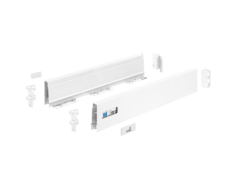 Sada obsahuje komponenty pro sestavení zásuvky Innotech Atira: 2 ks bočního profilu zásuvky (levý a pravý), 2 ks čelních příchytů s rozpěrným pouzdrem, 2 ks držáku zadního panelu (levý a pravý) a 2 ks plastových krytek s logem Hettich.Doplňkové parametry