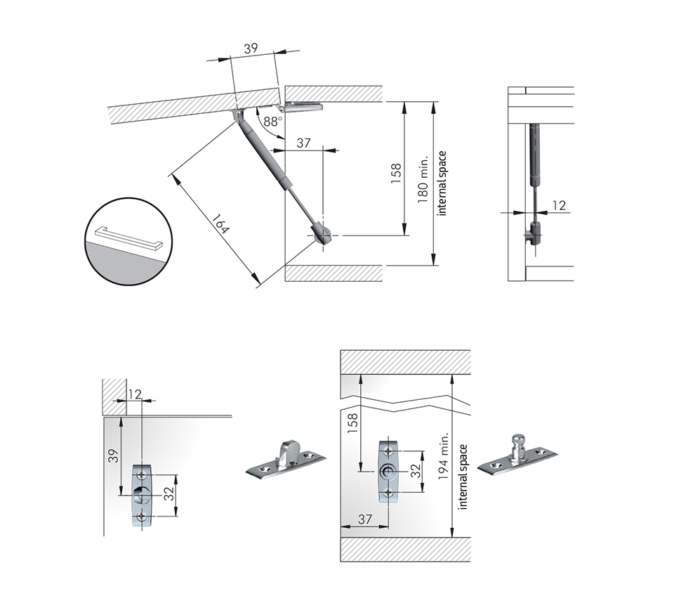 Klopna K12 s automatickým plným otvíráním. Pro dvířka o výšce 200-300mm.Pro bezúchytkové otevírání doporučujeme použít sady pístů K-push.