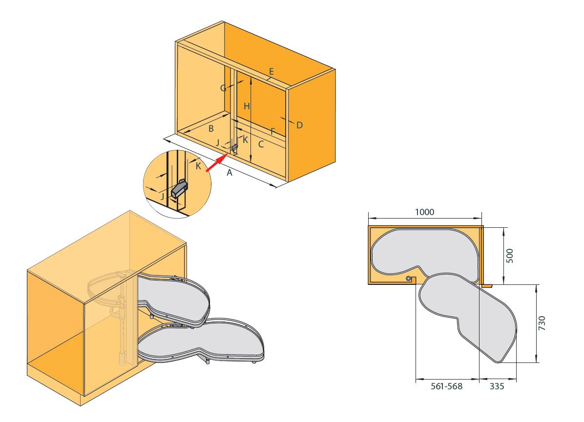 Sada dvou polic Arena CLASSIC chrom pro řešení spodní rohové skříňky (tzv. slepého rohu) LeMans II. Dno s Anti-slip nesmekovou povrchovou úpravou. K LeMans II je možné přidat externí tlumič který polici dotáhne, při zavření utlumí a zabrání rázu.Pro korpus 1000mm a otvor 561-568mm. Montáž tlumiče na vnější rameno. Vnitřní rozměry korpusu: šířka: 960, hloubka 500, výška: 600-750mm případně 720-900mm. Minimální rozměr dveří 561-568mm. Montážní tyč + uchycení na bok kospusu - 160132, externí tlumič pro pravou variantu - 318463. Nosnost police 25kg.Doplňkové parametry
