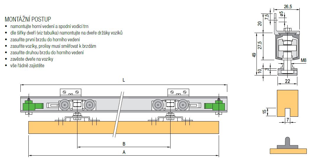 Nosnost: 40 kg Délka pojezd. profilu: 1900 mm. Skladem i verze s tlumením - 393305 Posuvné interiérové kování 1399/190 40kg 2x tlumičDoplňkové parametry