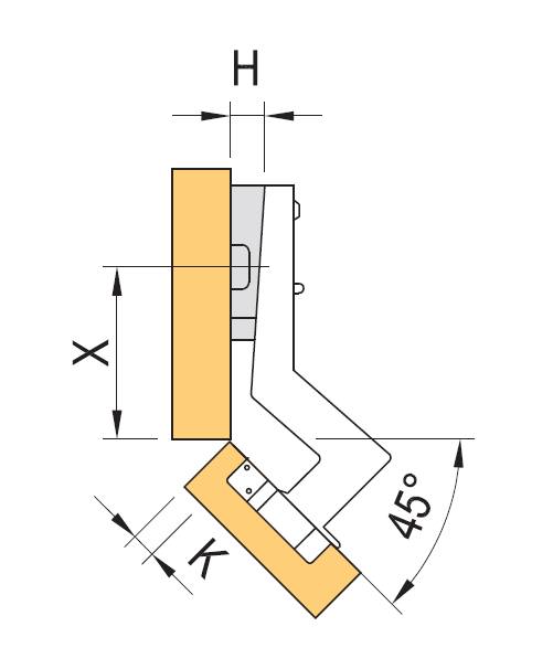 Závěs KLIP úhlový 45° na vrut s integrovaným tlumením. Úhel otevření 110°. Rozteč vrutů 45mm a 9,5mm od středu misky. Miska 35mm. Montáž a demontáž dvířek na korpus bez nářadí. Doporučené podložky: H0 vrut 92590T a s eurovruty 92591T H2 vrut 92592T, H2 Euro 92593T.Doplňkové parametry