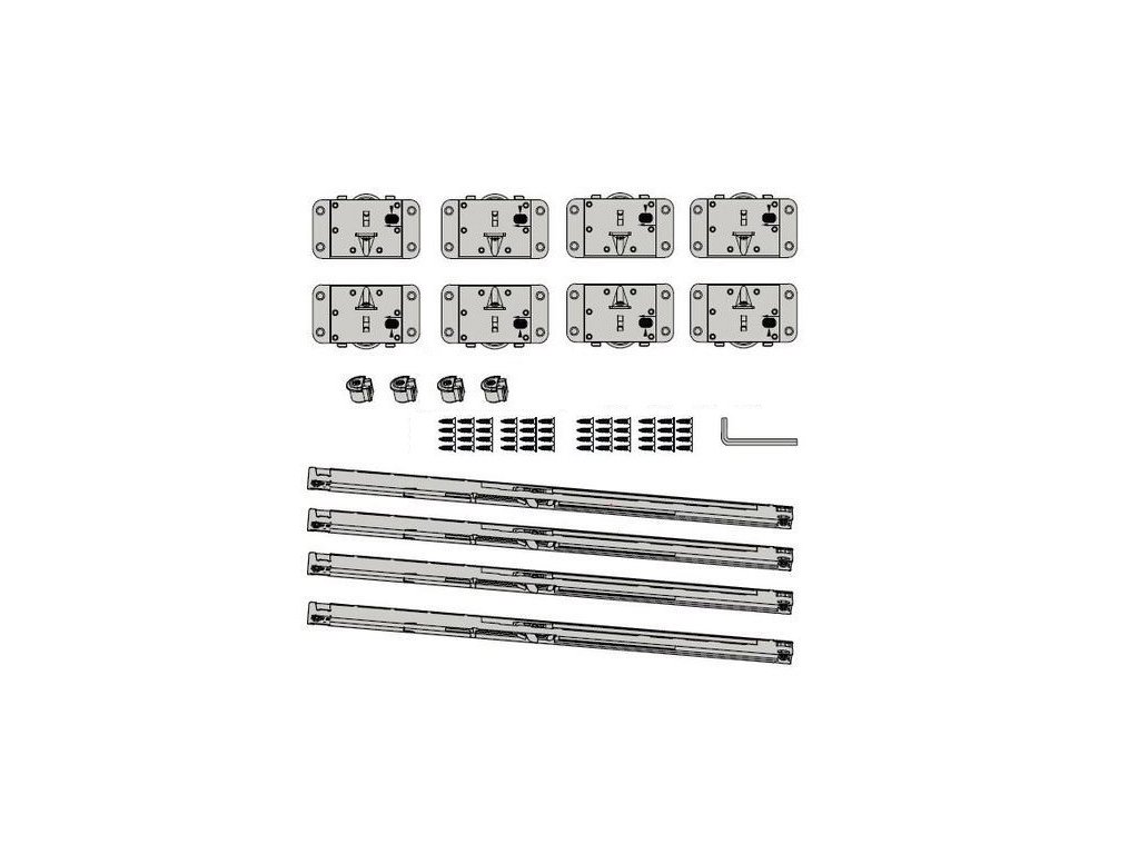 Sada kování na skříňové posuvné dveře, nosnost 40 kg/dveře, sada pro troje dveře. K dispozici vedení pro délky 1,5m, 2m a 3m. Doporučená minimální šířka křídla - 500mm při dodržení poměrů stran 3:1 (výška:šířka). Sada obsahuje: 4x tlumič 12x vozík 4x spodní doraz 48x vrut 1x imbusový klíč Upozornění k montáži:1. před vložením vedení do korpusu vložte do kolejnice tlumiče a koncovky Pozor na správnou orientaci tlumiče - šipky musí směřovat do středu korpusu.