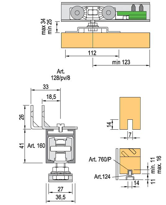 Kování pro posuvné interiérové dveře do 160kg. včetně 6 ks příchytů profilu. příslušný vodící profil = DT305-7 (2-3-6m).Ložiska.Doplňkové parametry